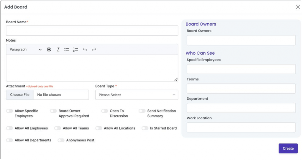 Setting up a new board is fast and simple. Whether you’re creating a project board or a dedicated HR onboarding board for new team members, our platform has you covered with easy-to-use templates that fit your needs. With visual task boards that promote team collaboration, you can easily keep everything organized and stay on top of tasks. From tracking ongoing projects to onboarding new hires or keeping track of remote perks, our boards ensure that your team remains focused, aligned, and productive.