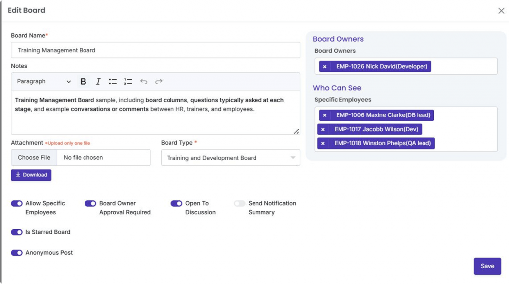 Foster better communication within your team with Q&A boards. Team members can quickly ask questions, share feedback, and resolve issues without leaving the board. Whether you’re managing a project task board or an HR onboarding board, this feature streamlines collaboration. Keep everything centralized within the board to ensure fast responses and efficient decision-making.