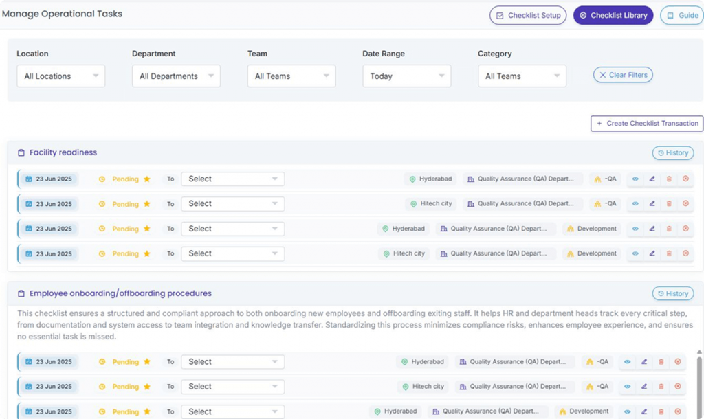 Pixelshr’s Manage Operational Tasks module turns each checklist into a live dashboard. Filter tasks by site, department, team, category, or custom date range to see exactly where work is flowing—and where it’s stuck.