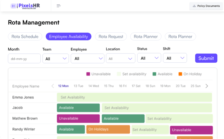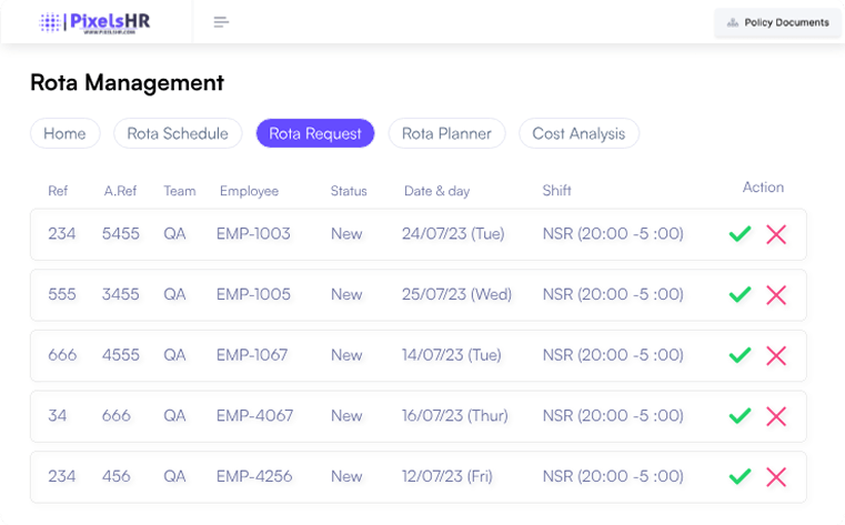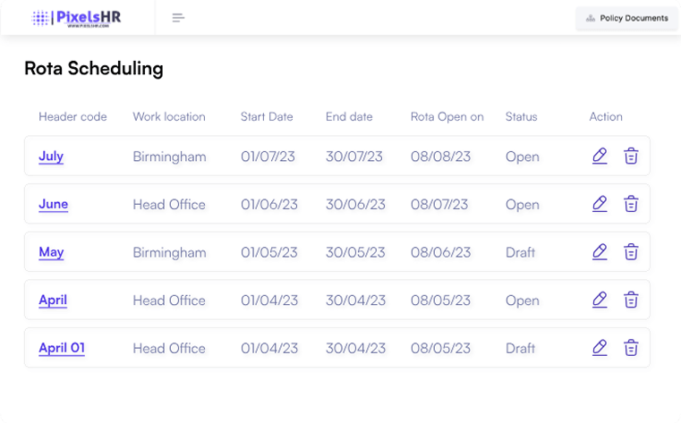 “Keep your rota-related documents, from shift requests to staff availability, organised and accessible. With PixelsHR, managing your rota documentation is as straightforward as your scheduling.