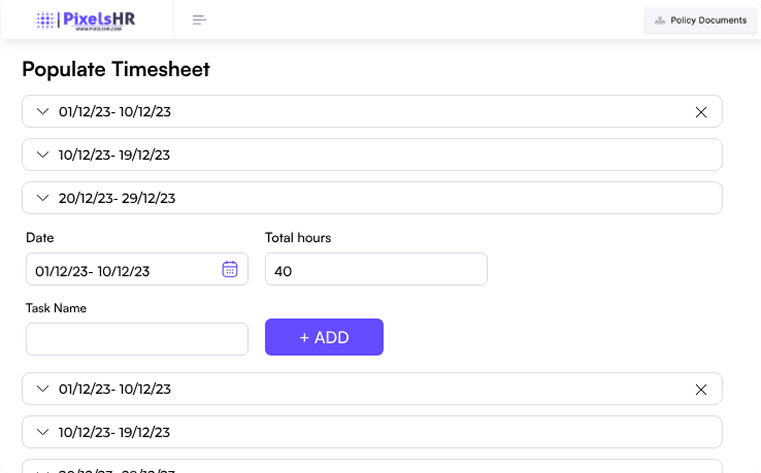 PixelsHR lets you populate timesheets tailored to each contract or employment type to ensure every timesheet reflects the specific needs and schedules of your diverse team members