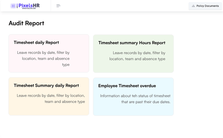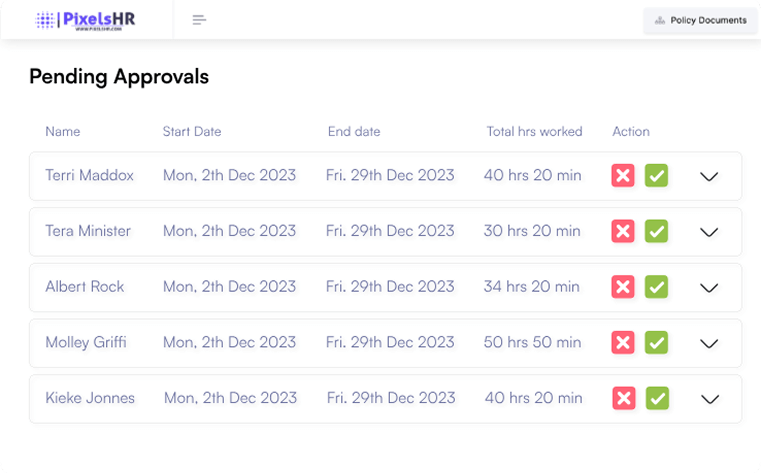 Approve or reject timesheets with confidence in PixelsHR. Our system gives you the clarity to make quick decisions, ensuring that timesheet approvals are accurate and reflective of the work done.