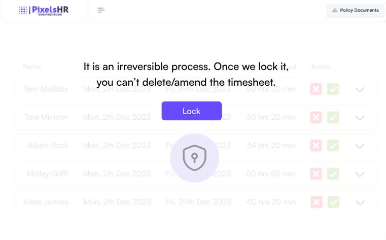 Travel back in time and freeze those hours! PixelsHR’s timesheet lock secures your weekly records at a specific point, preventing last-minute changes and guaranteeing reliable data.